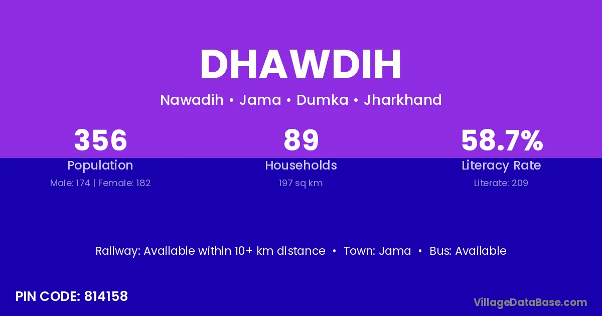 Dhawdih village has a total population of 356 people, of which 174 are males and 182 are females.