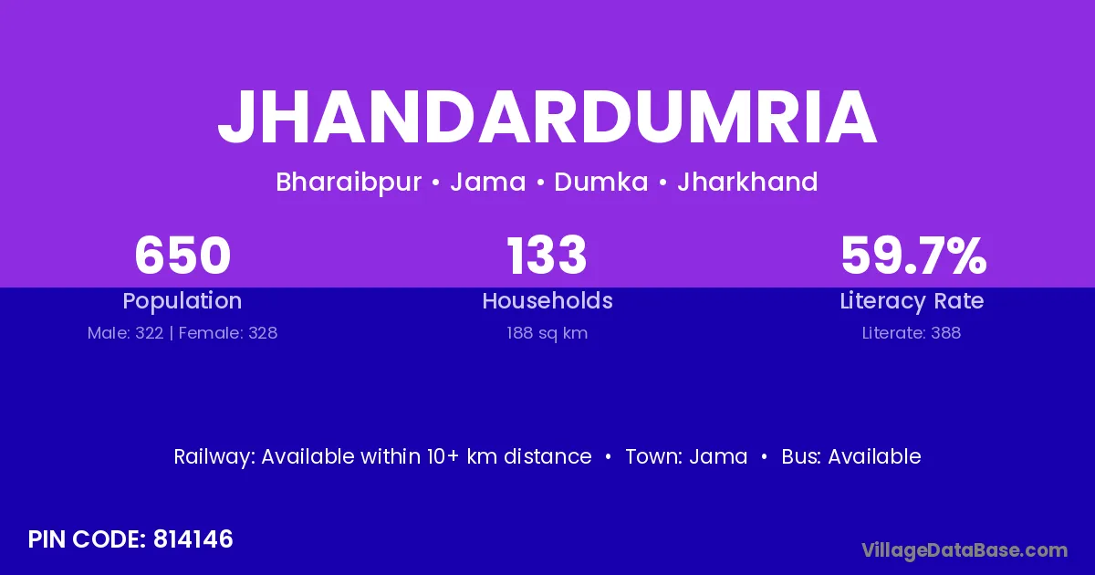 Jhandardumria village has a total population of 650 people, of which 322 are males and 328 are females.