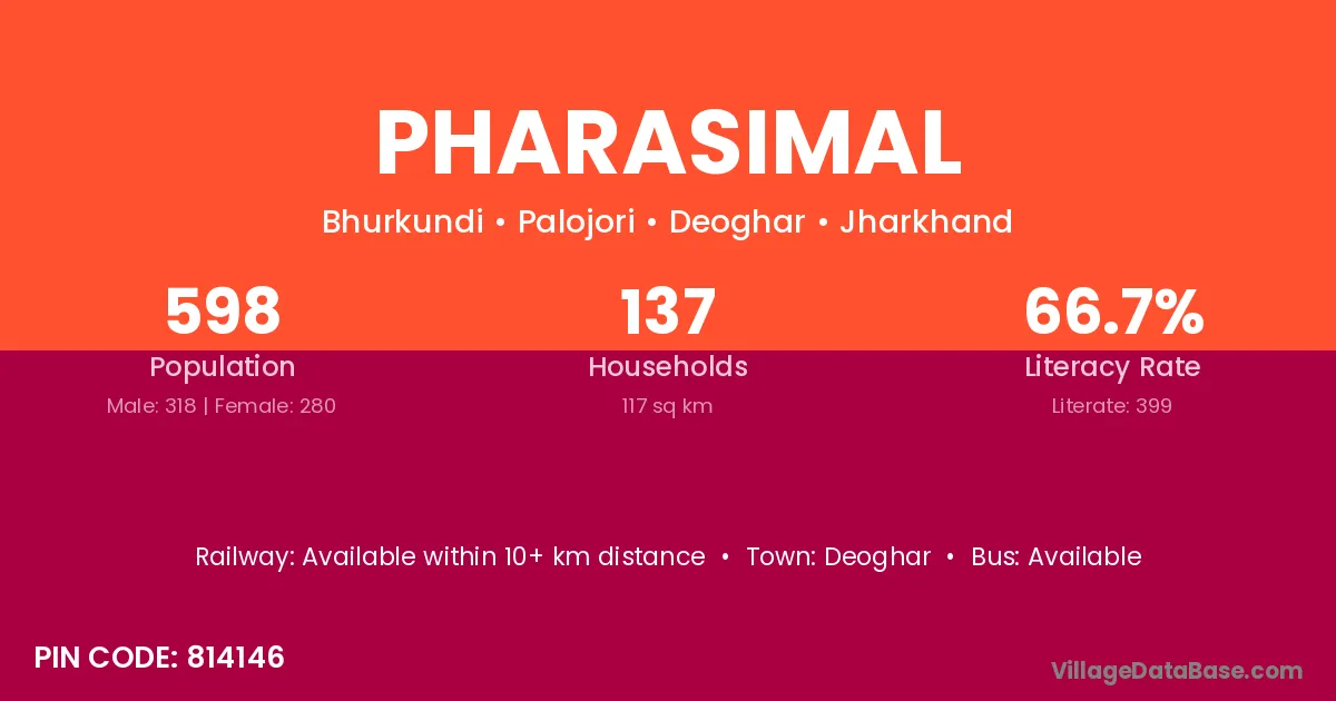 The literacy rate of Pharasimal village is 37.47%. Male literacy stands at 42.59% and female literacy at 32.77%.