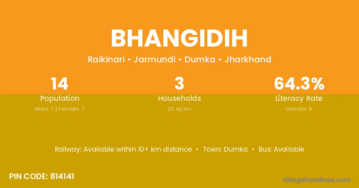 Bhangidih village has a total population of 14 people, of which 7 are males and 7 are females.