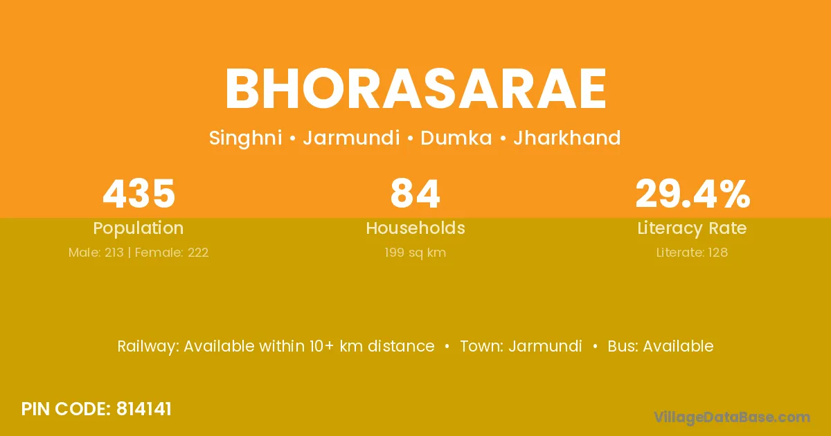 Bhorasarae village has a total population of 435 people, of which 213 are males and 222 are females.