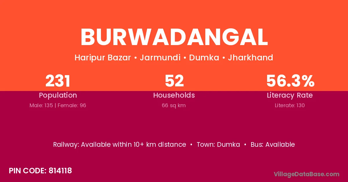 Burwadangal village has a total population of 231 people, of which 135 are males and 96 are females.