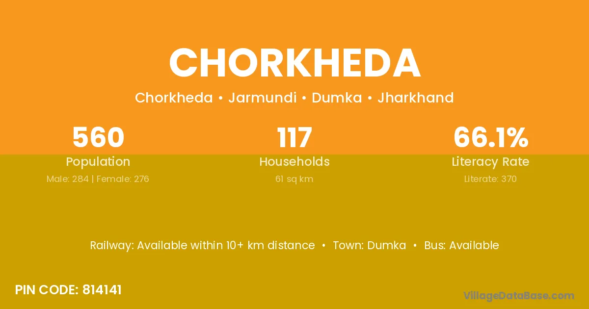 Dumka is the nearest town to Chorkheda village for major economic activities