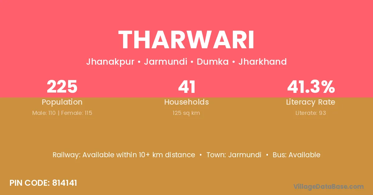 Tharwari village has a total population of 225 people, of which 110 are males and 115 are females.