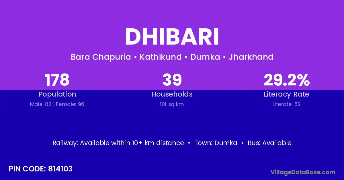 Dhibari village has a total population of 178 people, of which 82 are males and 96 are females.