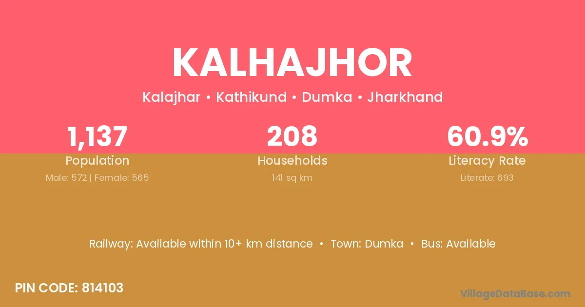 Kalhajhor village has a total population of 1,137 people, of which 572 are males and 565 are females.