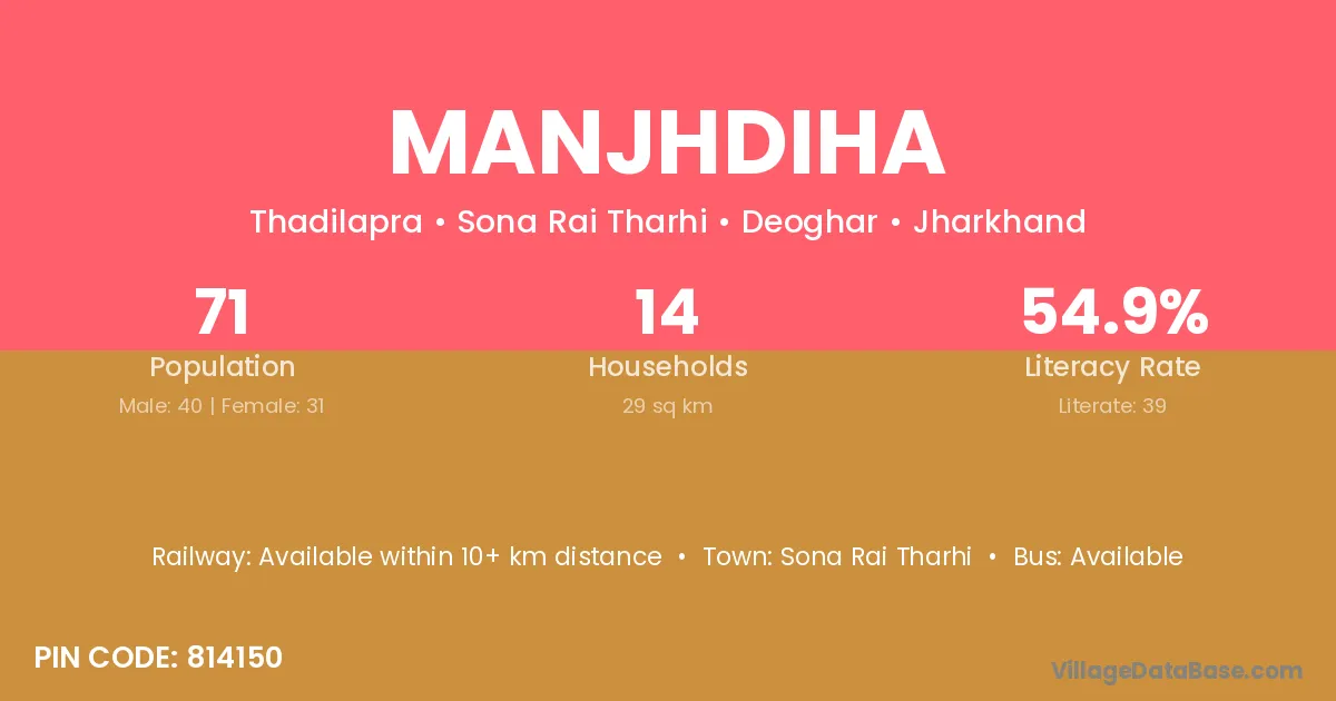 The literacy rate of Manjhdiha village is 17.95%. Male literacy stands at 21.69% and female literacy at 13.70%.