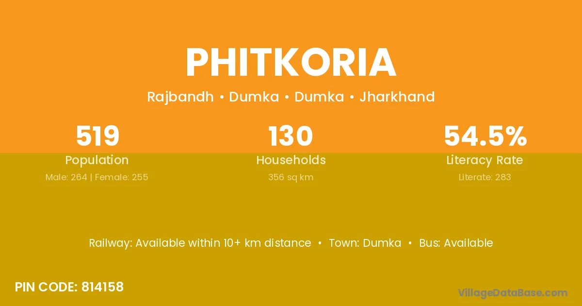 Dumka is the nearest town to Phitkoria village for major economic activities