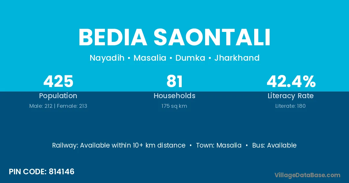 Bedia Saontali village has a total population of 425 people, of which 212 are males and 213 are females.