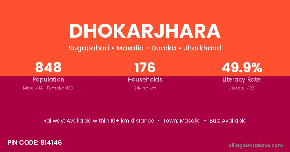 Dhokarjhara village has a total population of 848 people, of which 418 are males and 430 are females.