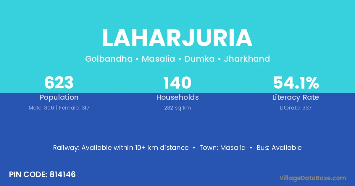 Laharjuria village has a total population of 623 people, of which 306 are males and 317 are females.