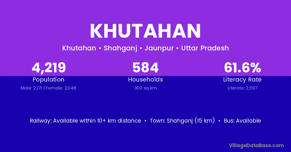The literacy rate of Khutahan village is 43.52%. Male literacy stands at 52.97% and female literacy at 34.33%.
