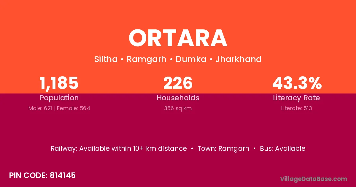 Ortara village has a total population of 1,185 people, of which 621 are males and 564 are females.