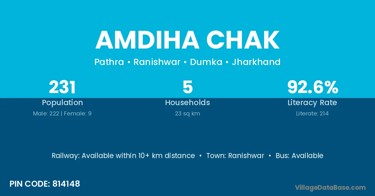 Amdiha Chak village has a total population of 231 people, of which 222 are males and 9 are females.