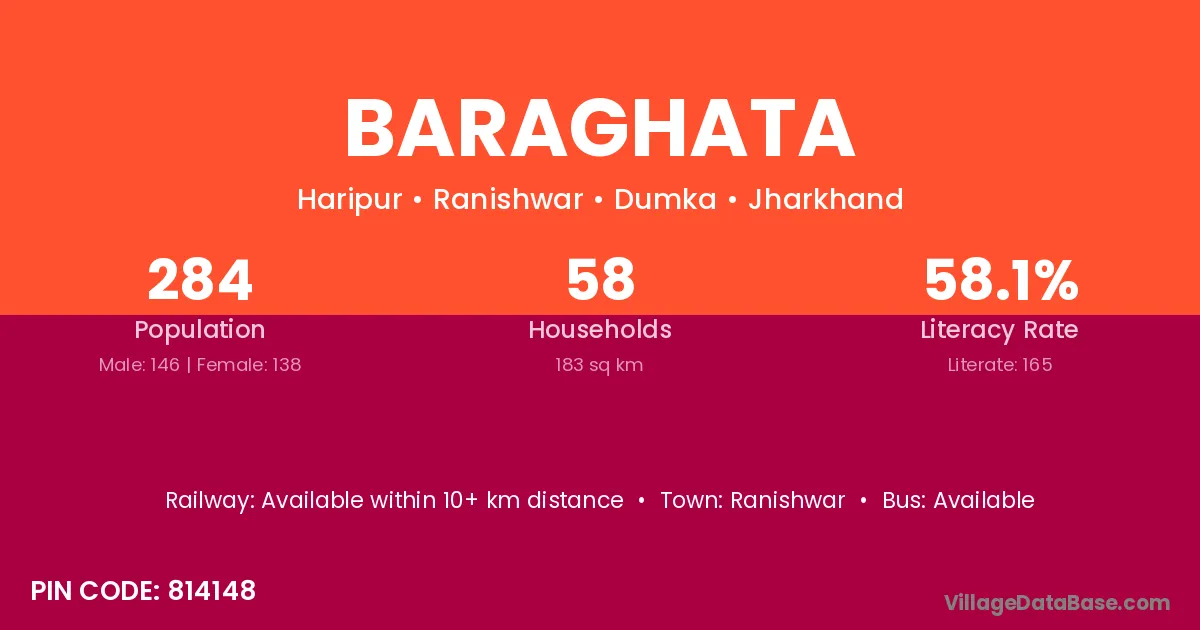 Baraghata village has a total population of 284 people, of which 146 are males and 138 are females.
