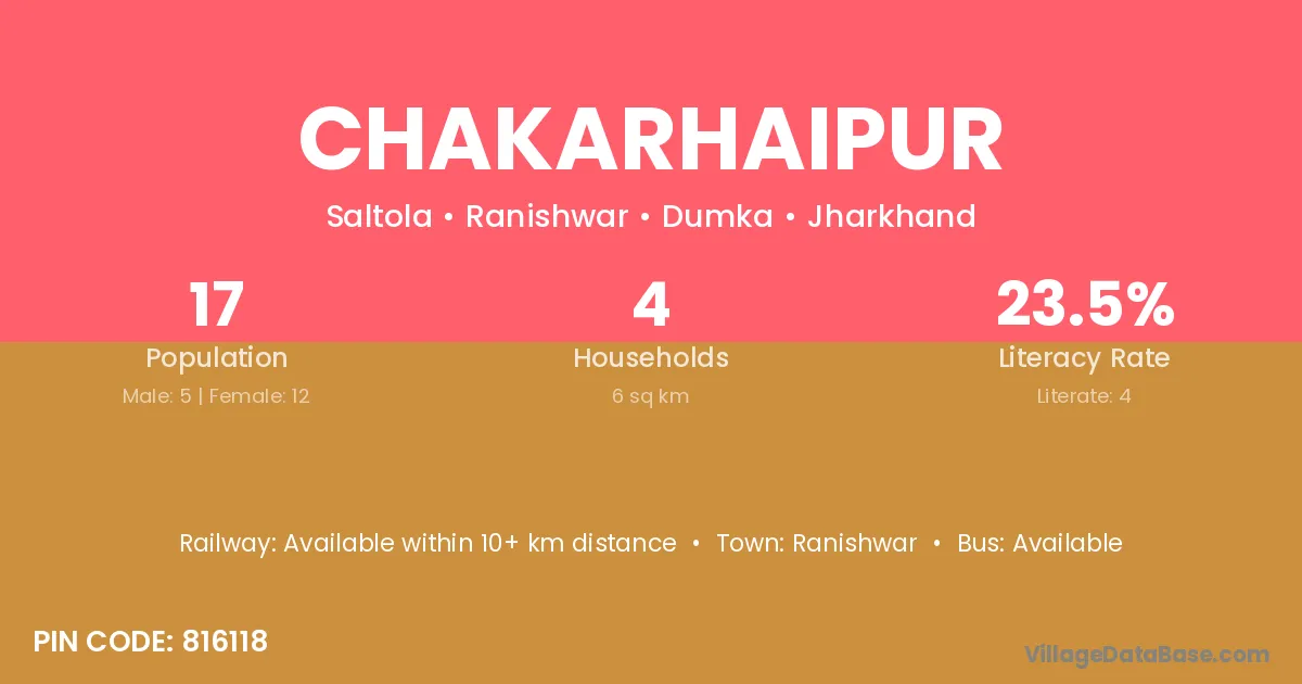 Chakarhaipur village has a total population of 17 people, of which 5 are males and 12 are females.