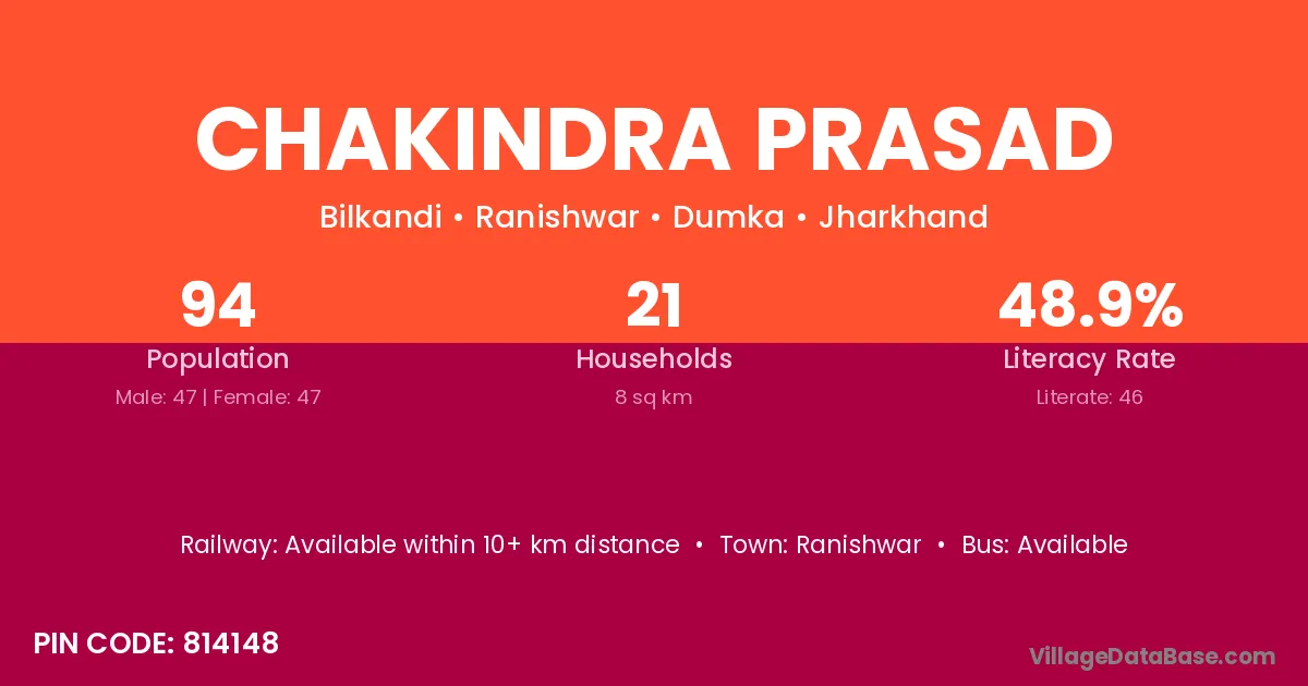 Chakindra Prasad village has a total population of 94 people, of which 47 are males and 47 are females.