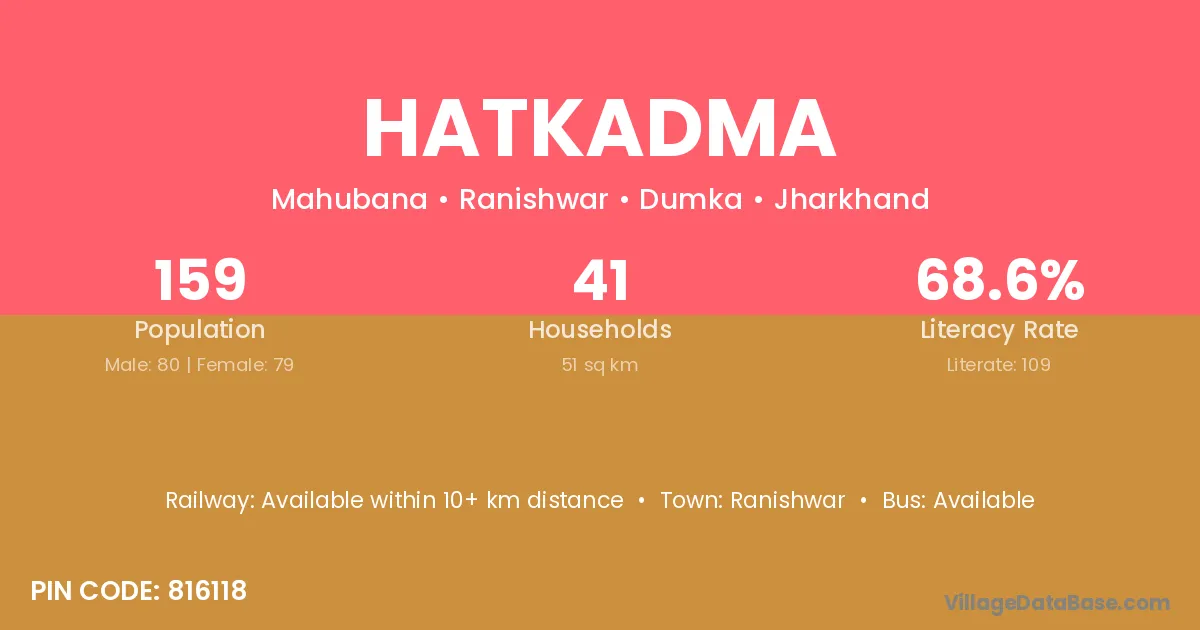 Hatkadma village has a total population of 159 people, of which 80 are males and 79 are females.