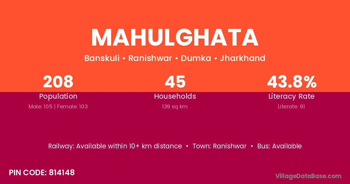 Mahulghata village has a total population of 208 people, of which 105 are males and 103 are females.