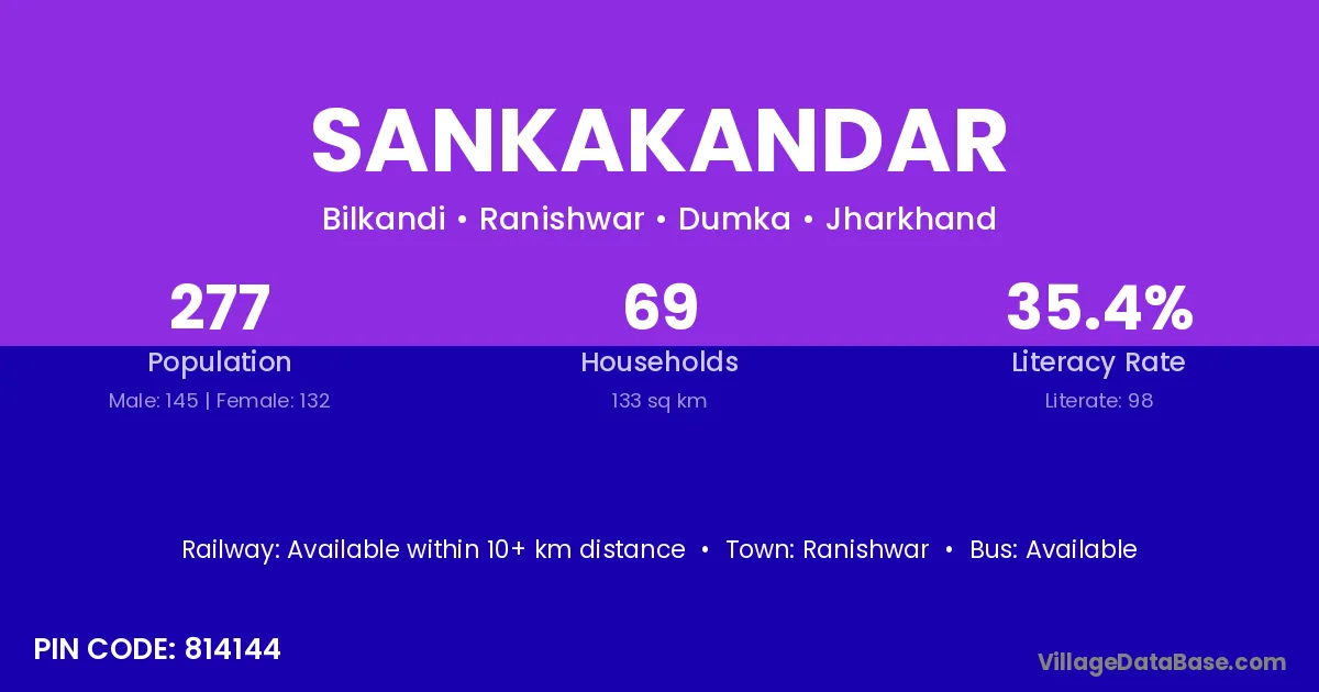 Sankakandar village has a total population of 277 people, of which 145 are males and 132 are females.