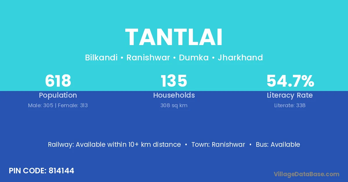Tantlai village has a total population of 618 people, of which 305 are males and 313 are females.