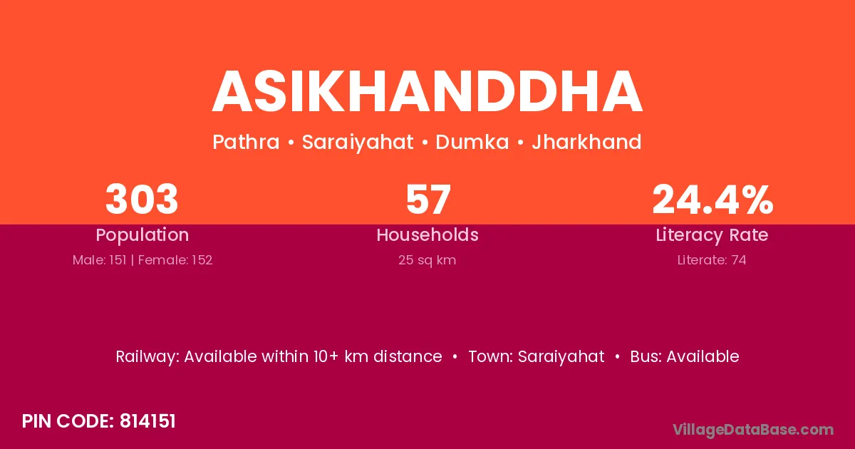 Asikhanddha village has a total population of 303 people, of which 151 are males and 152 are females.