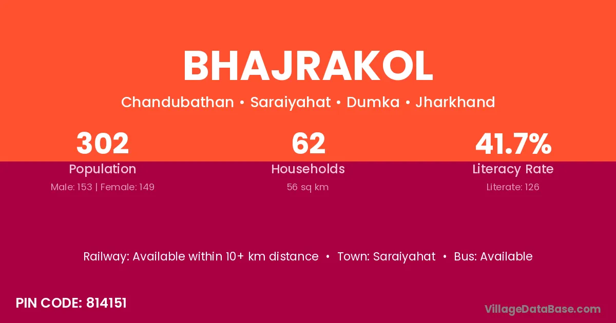 Bhajrakol village has a total population of 302 people, of which 153 are males and 149 are females.