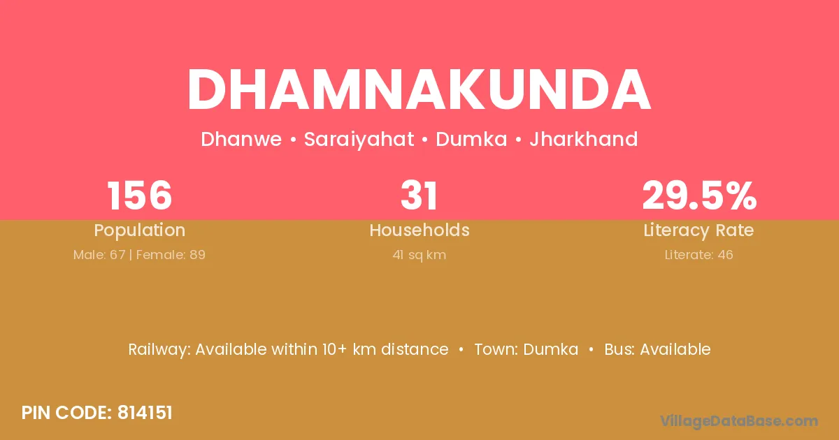 Dhamnakunda village has a total population of 156 people, of which 67 are males and 89 are females.