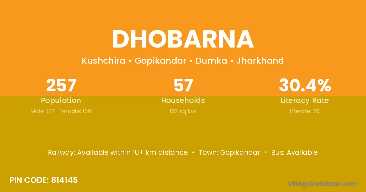 Dhobarna village has a total population of 217 people, of which 111 are males and 106 are females.