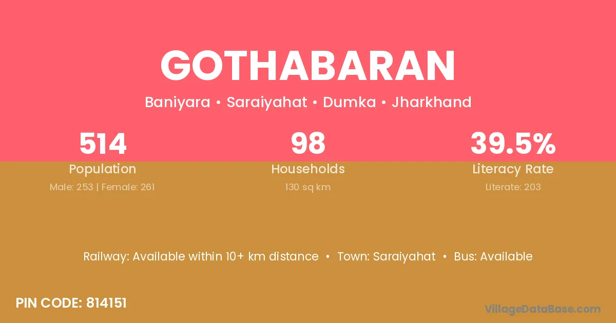 Gothabaran village has a total population of 514 people, of which 253 are males and 261 are females.