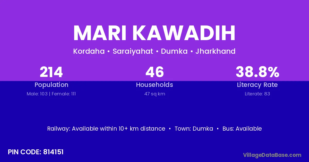 Mari Kawadih village has a total population of 214 people, of which 103 are males and 111 are females.