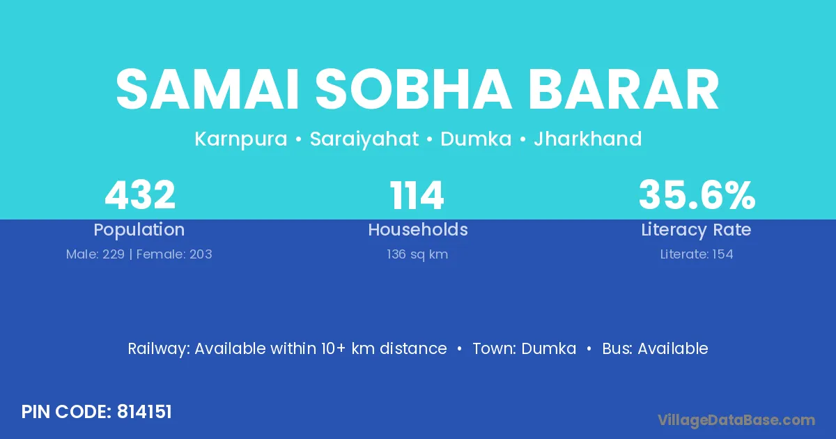 Dumka is the nearest town to Samai Sobha Barar village for major economic activities