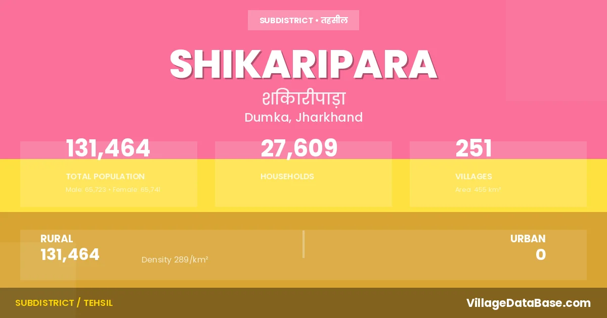 Shikaripara is a town and Subdivision in the Dumka district of the Jharkhand. In India, a Subdivision is a subdivision of a district responsible for the administration and revenue collection of a specific area within the district. Subdivisions play a crucial role in the local governance structure, contributing significantly to the development and administration of their communities.