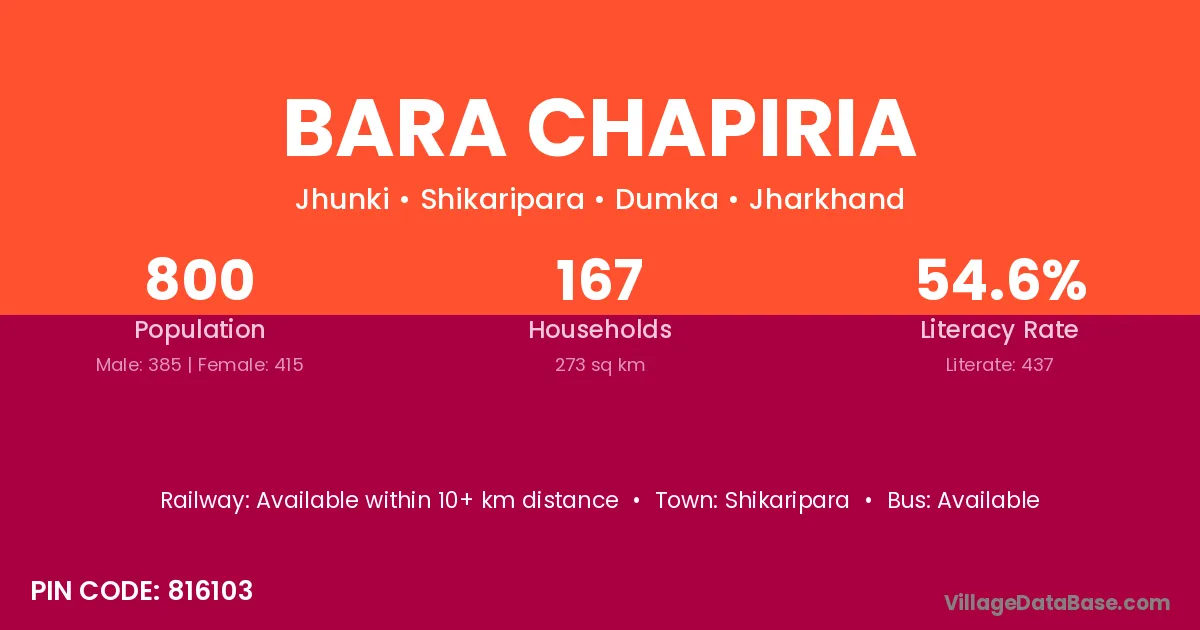Bara Chapiria village has a total population of 800 people, of which 385 are males and 415 are females.