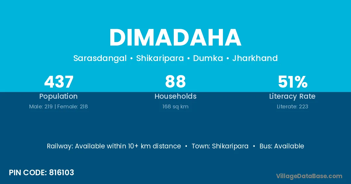 Dimadaha village has a total population of 437 people, of which 219 are males and 218 are females.