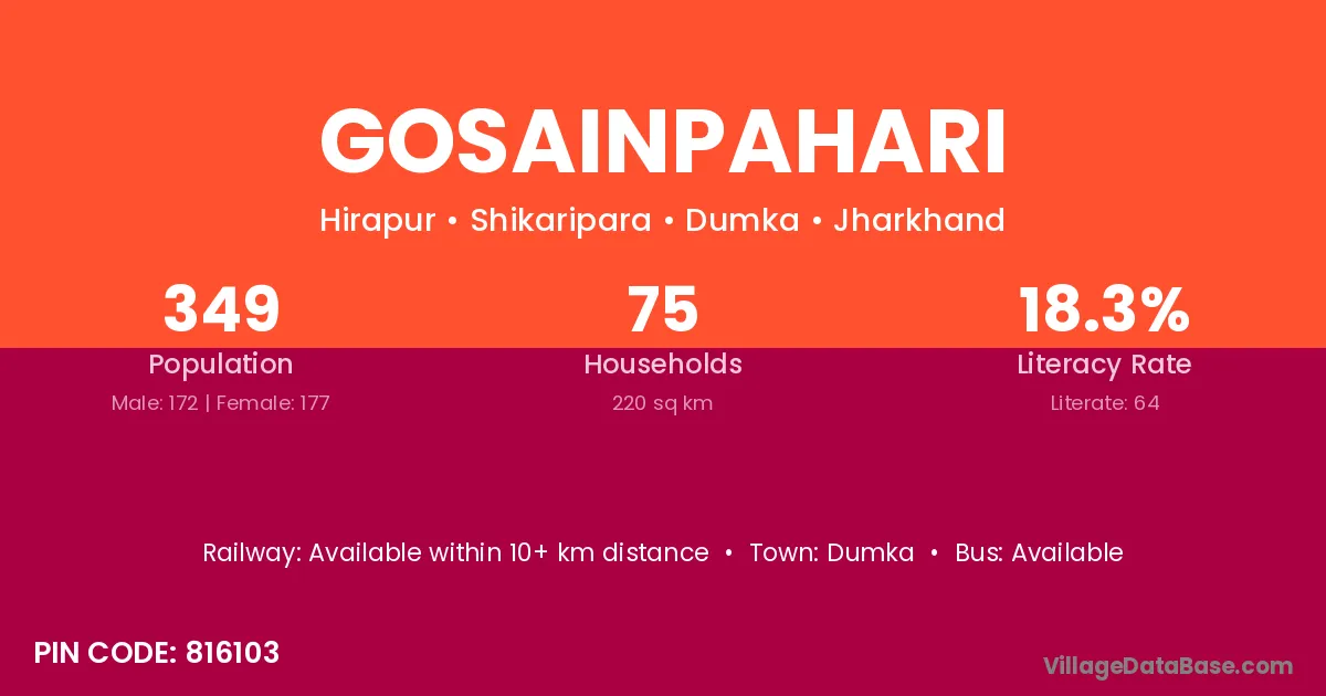 Gosainpahari village has a total population of 349 people, of which 172 are males and 177 are females.