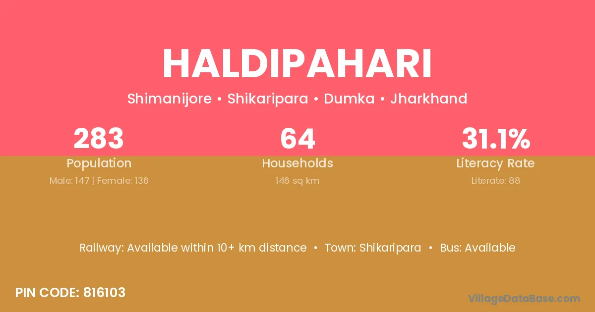 Haldipahari village has a total population of 283 people, of which 147 are males and 136 are females.
