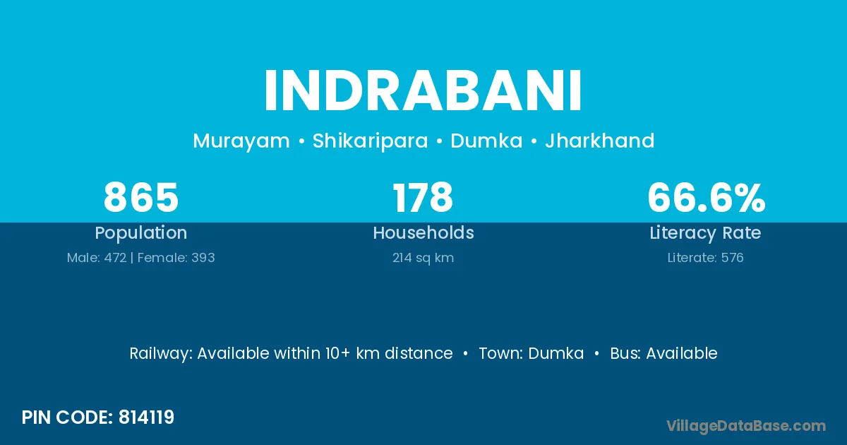 Indrabani village has a total population of 865 people, of which 472 are males and 393 are females.