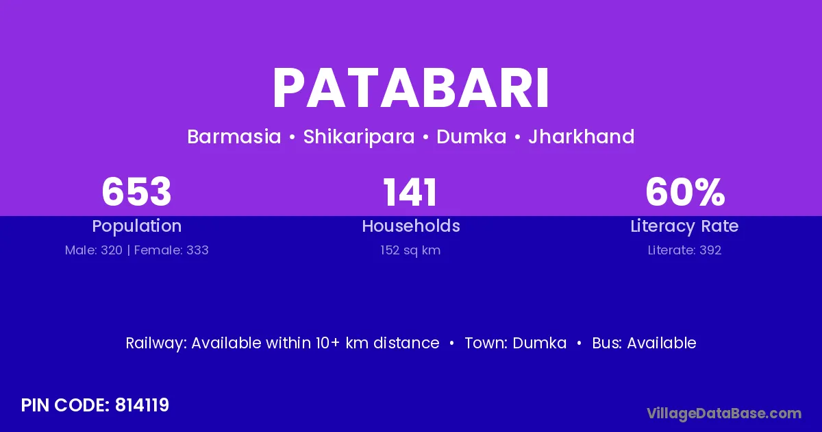 Patabari village has a total population of 653 people, of which 320 are males and 333 are females.