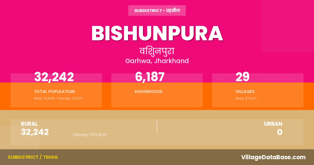 According to the 2011 census The total area of Bishunpura Subdivision is 97 km², with a population of 32242 people. The population density is 333 inhabitants per square kilometre, and there are approximately 6187 houses in the sub district.