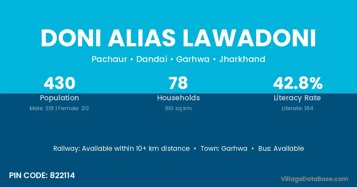 Doni Alias Lawadoni village has a total population of 430 people, of which 218 are males and 212 are females.