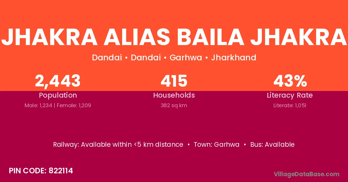 Jhakra Alias Baila Jhakra village has a total population of 2,443 people, of which 1,234 are males and 1,209 are females.
