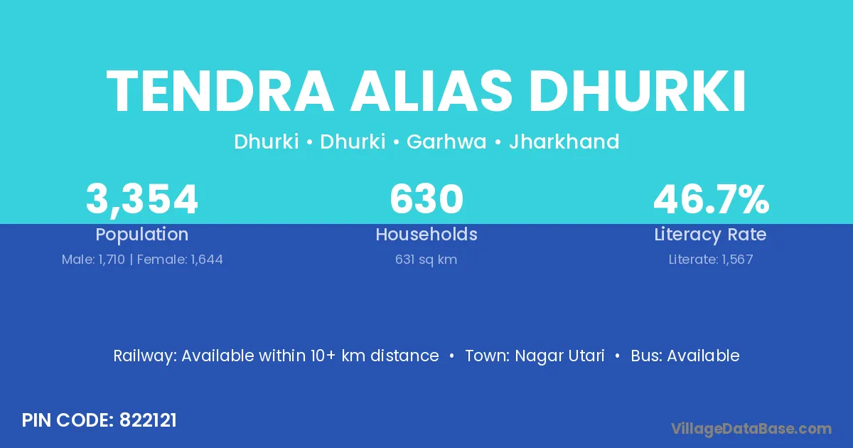 Tendra Alias Dhurki village has a total population of 3,354 people, of which 1,710 are males and 1,644 are females.