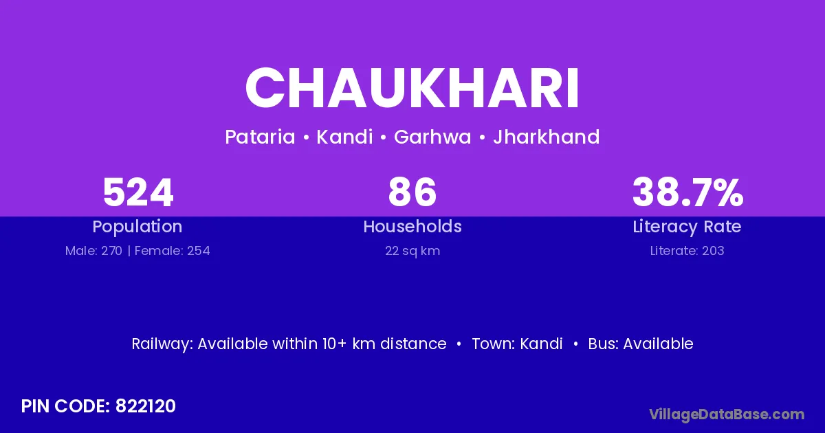 The literacy rate of Chaukhari village is 38.74%. Male literacy stands at 51.85% and female literacy at 24.80%.