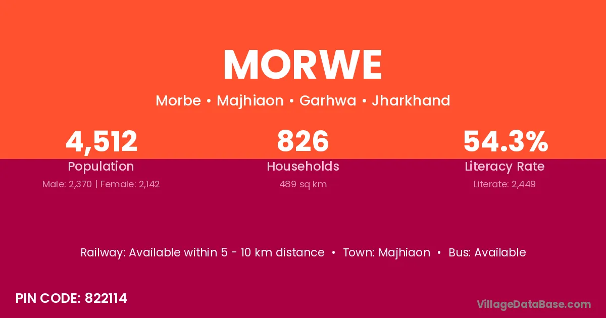 Morwe village has a total population of 4,512 people, of which 2,370 are males and 2,142 are females.
