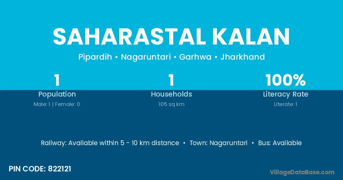 The literacy rate of Saharastal Kalan village is 100.00%. Male literacy stands at 100.00% and female literacy at 0%.