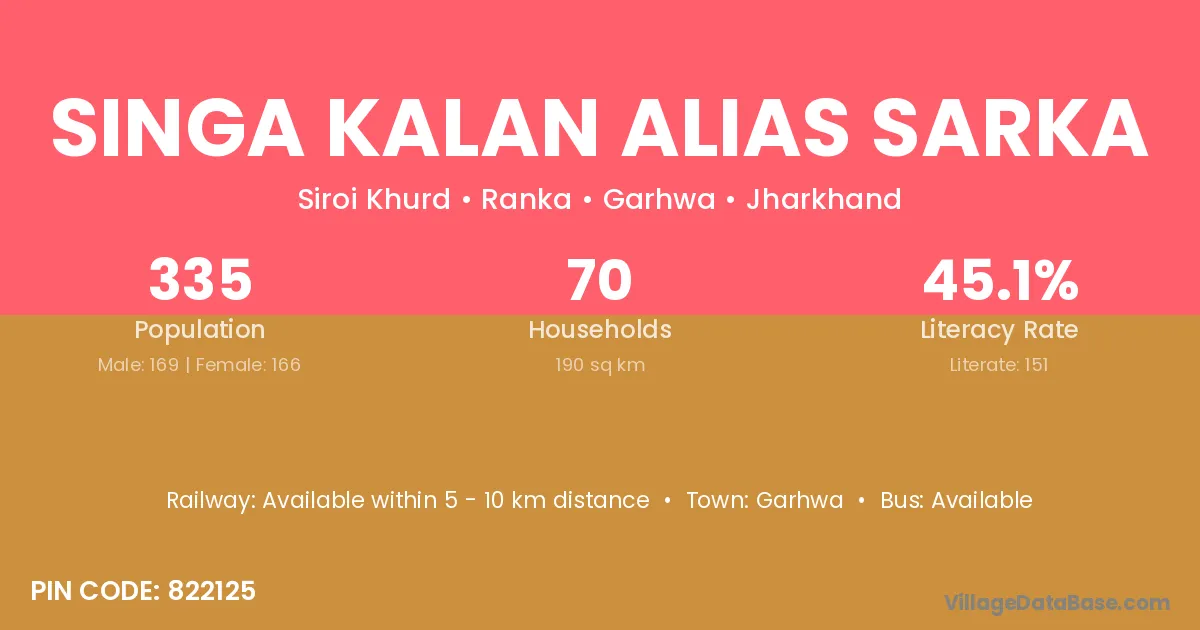 Singa Kalan Alias Sarka village has a total population of 335 people, of which 169 are males and 166 are females.