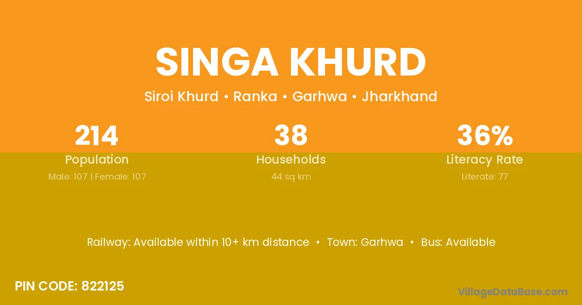 Singa Khurd village has a total population of 214 people, of which 107 are males and 107 are females.