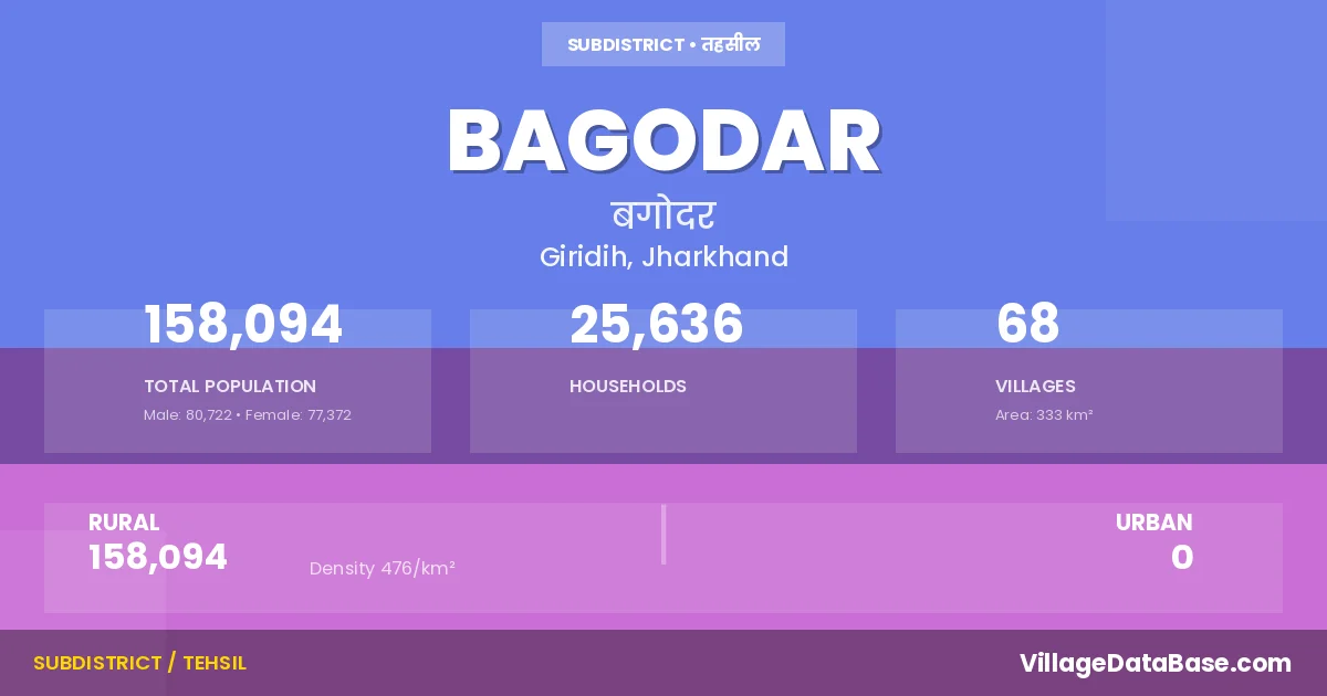According to the 2011 census The total area of Bagodar Subdivision is 333 km², with a population of 158094 people. The population density is 476 inhabitants per square kilometre, and there are approximately 25636 houses in the sub district.