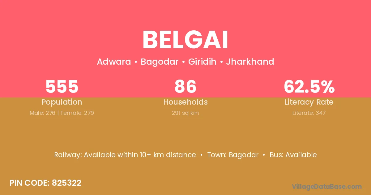 Belgai village has a total population of 555 people, of which 276 are males and 279 are females.